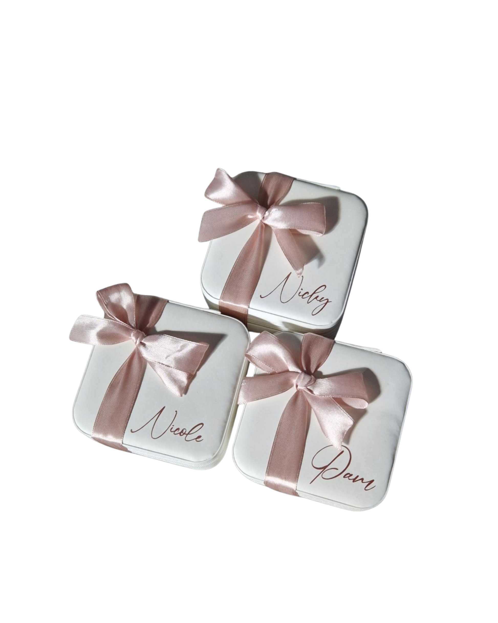 A sophisticated square jewelry box in white, adorned with a dusty pink silk ribbon and customized with your name or initial. The perfect touch for presenting fine jewelry, personalized accessories, or special gifts for bridesmaids, brides, birthdays, and unforgettable moments.