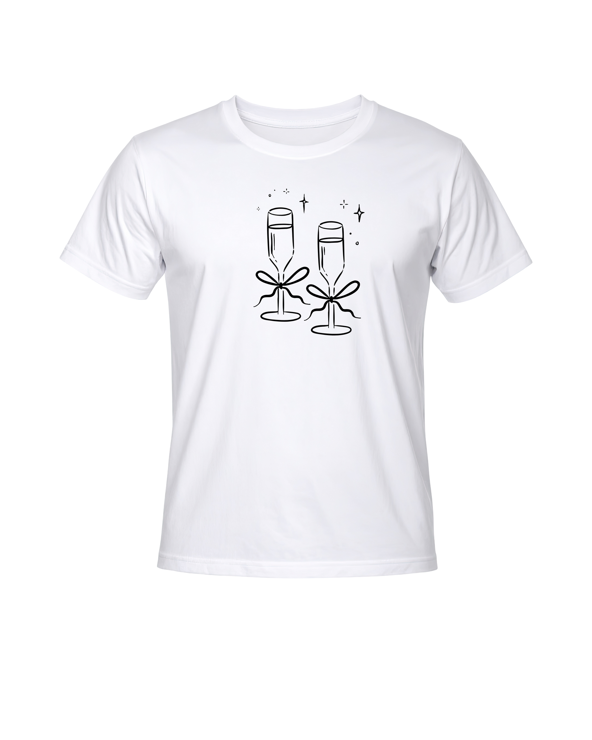 Celebrate every special moment in style with this minimalist t-shirt featuring two toasting glasses with bows, a symbol of unity, joy, and celebration. Perfect for weddings, anniversaries, bachelorette parties, elegant events, or as a thoughtful gift.